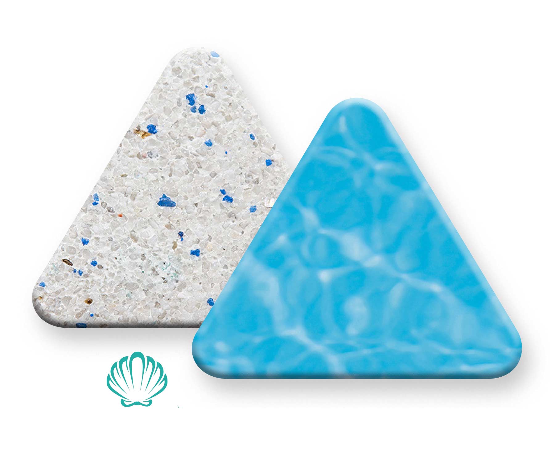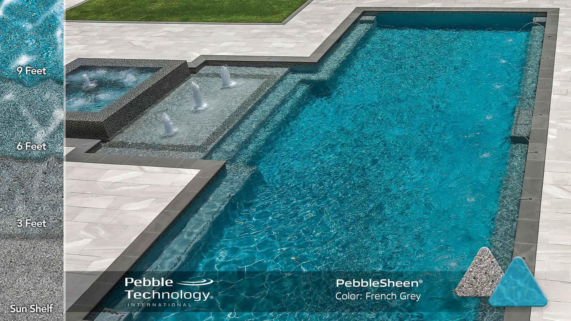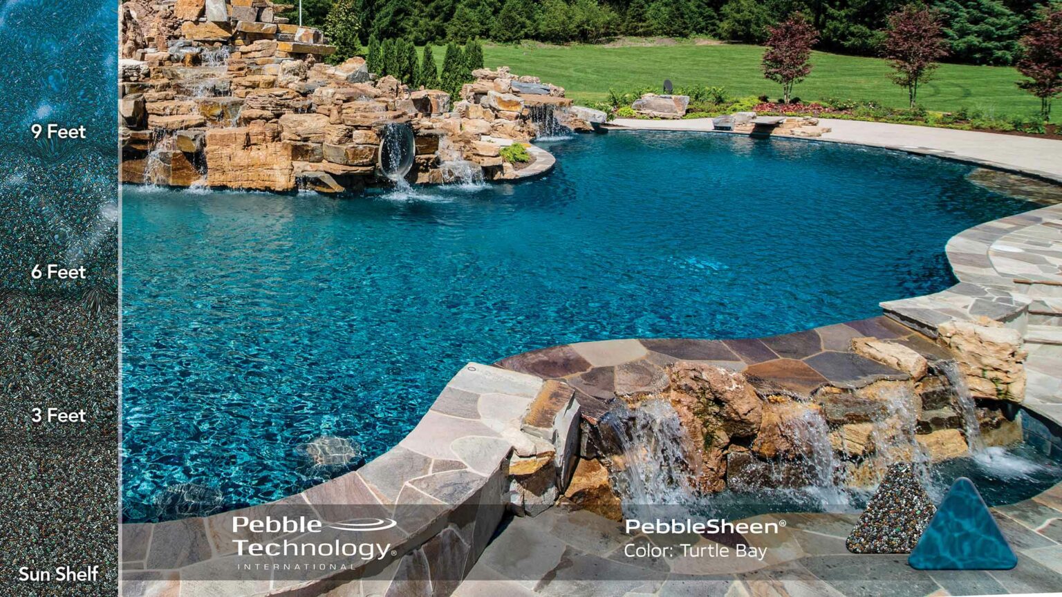 The actual water colour is produced by the refraction of light as it passes through water reflecting with the pebble surface. As a result the shades deepen with the pool's depth to give the most natural look possible.
