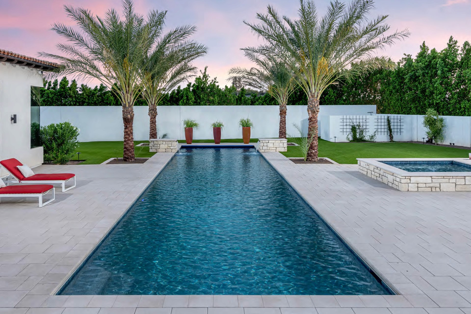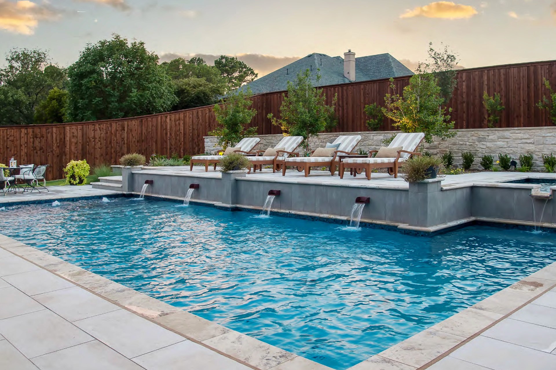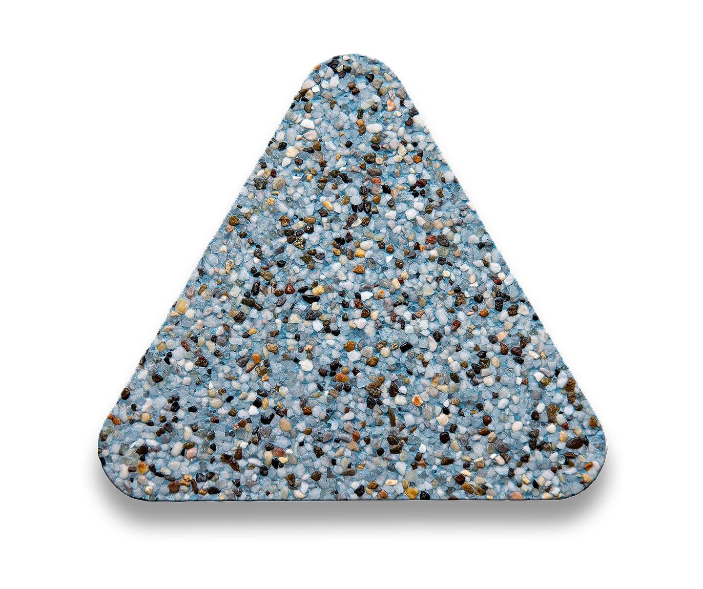 A combination of white, gold, grey and dark brown pebbles creates a light to medium blue water color.